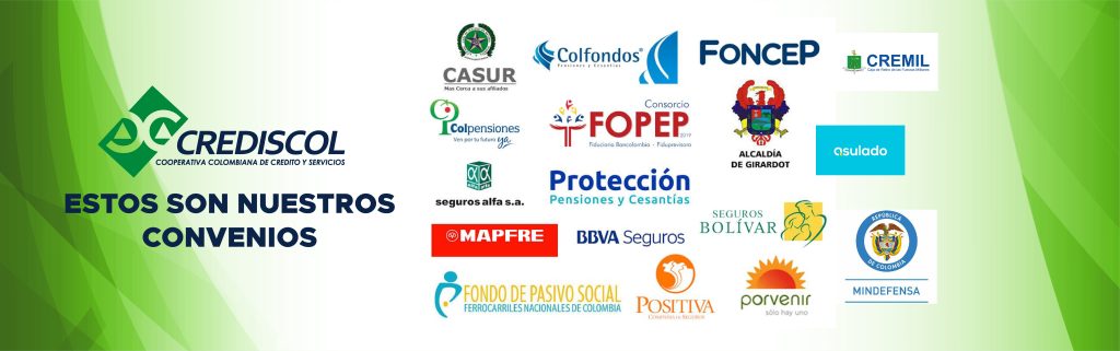 Para el descuento directo o por libranza de tus líneas de crédito, CREDISCOL tiene convenios con las siguientes pagadurías: De igual forma, para el cumplimiento de tu actividad cooperativa, CREDISCOL establece convenios temporales o permanentes con entidades que fomenten la educación, la recreación y el deporte en busca de mejorar la calidad de vida de tus asociados.